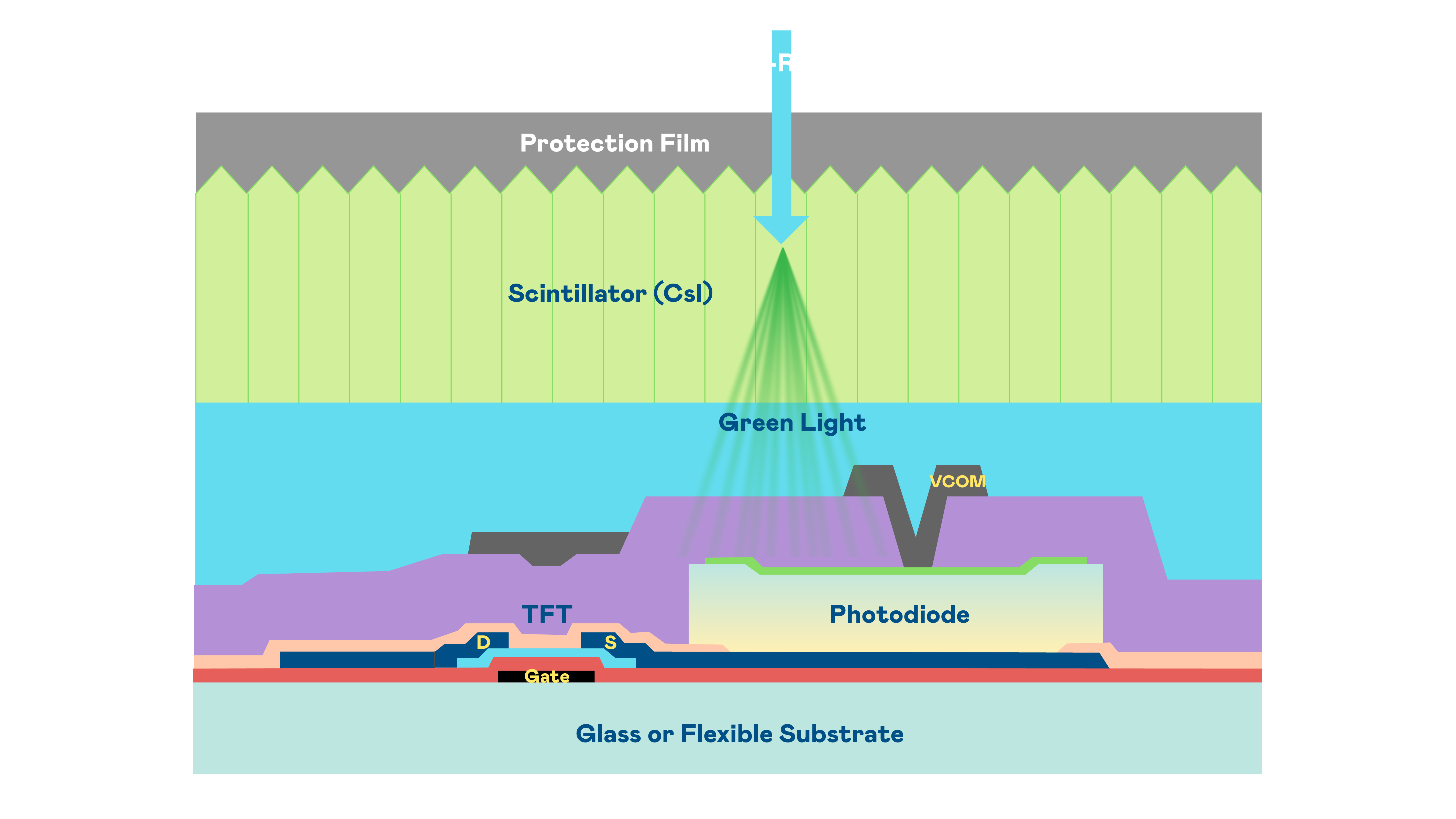 BBIN宝盈的X光影像感測陣列使用薄膜電晶體 (TFT) 作為每個像素的讀取開關,搭配光電二極體(Photodiode)的光電轉換元件,用以感測X光影像訊號。
